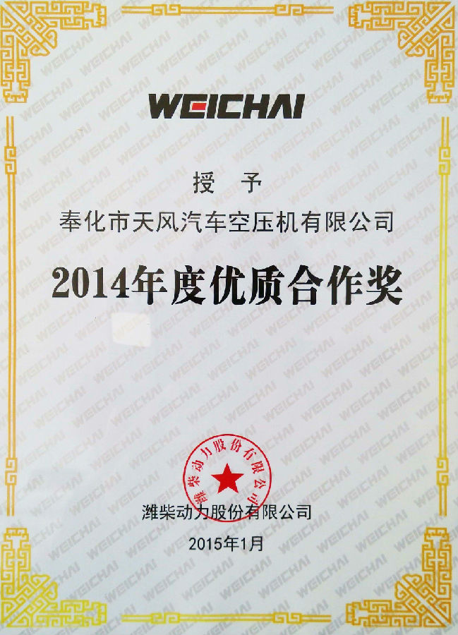 近年來,在集團俞沖董事長的宏觀決策,俞旭輝副董事長、王向陽總經(jīng)理的正確領導下,全體天風人共同努力,取得了不少榮譽:公司已是國家高新技術企業(yè),建立了天風汽車空壓機省級高新技術企業(yè)研究開發(fā)中心,是全國AAA級重質量守信用示范企業(yè),是浙江省知名商號,“天風”牌汽車空壓機是浙江省名牌產(chǎn)品;產(chǎn)品技術水平達到了國內同行業(yè)領先水平,特別是生產(chǎn)大排量雙缸水冷汽車空壓機、高排氣壓力的汽車空壓機:有水冷缸體的單、雙缸汽車空壓機,有節(jié)能環(huán)保汽車空壓機等新一代汽車空壓機,技術性能達到了同行業(yè)先進水平。公司由于嚴格按16949質量管理體系運行,持續(xù)的質量改進,持續(xù)的新產(chǎn)品開發(fā),交貨及時,服務盡心,贏得了濰柴的高度重視,從2005年——2014年連續(xù)10年榮獲濰柴動力“優(yōu)秀供應商”、“最佳合作獎”、“質量提升獎”、優(yōu)質合作獎等榮譽,2010年6月還正式簽訂了戰(zhàn)略合作協(xié)議,這在濰柴動力也是少見的。